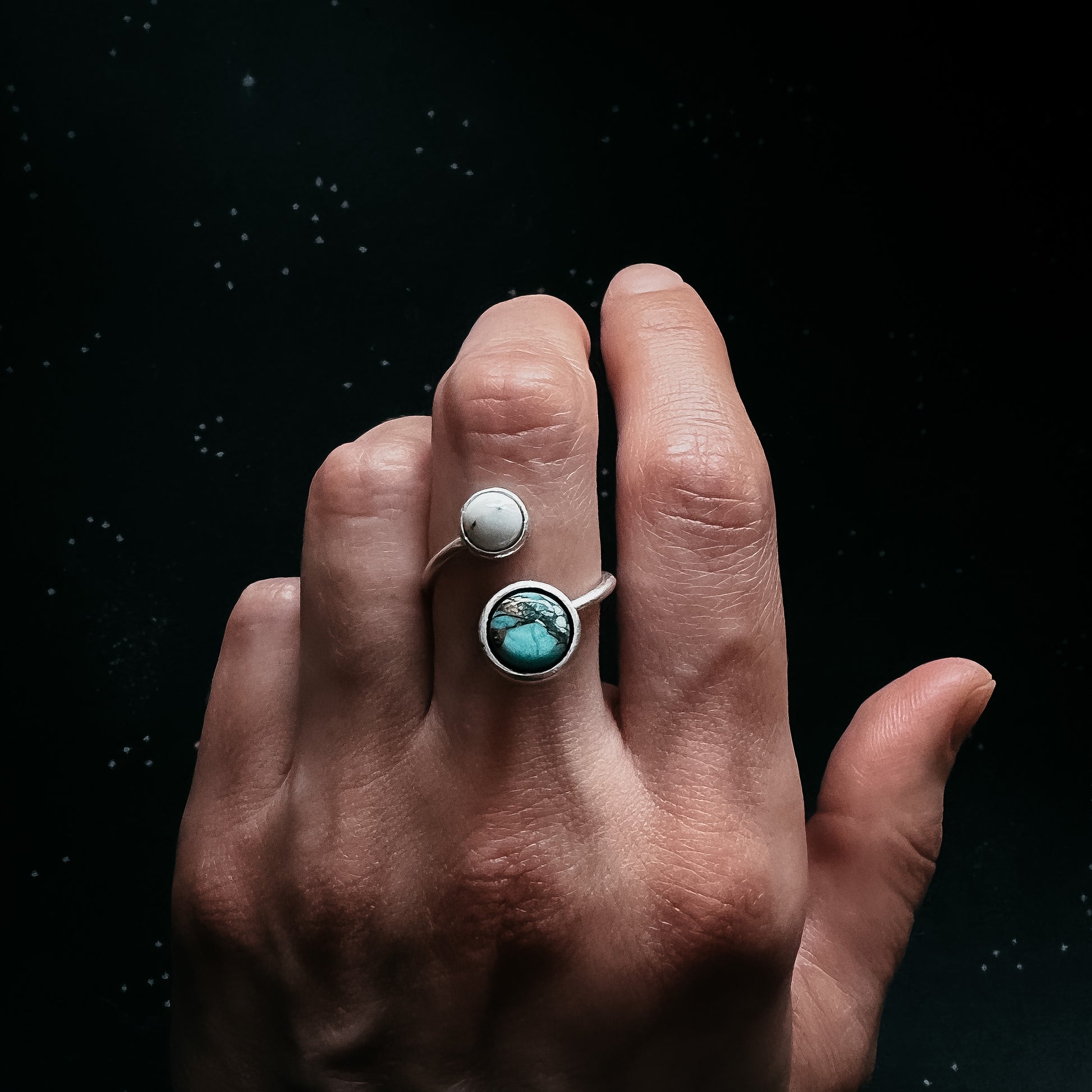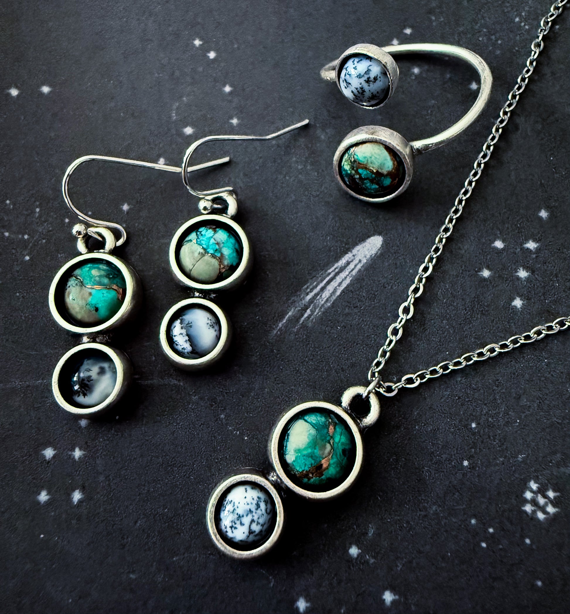 Delight in the beauty of the Earth and Moon with this simple jewelry set. Handcrafted with copper chrysocolla and dendrite stones, these timeless pieces embody celestial charm. Show off your unique style and passion for the stars!