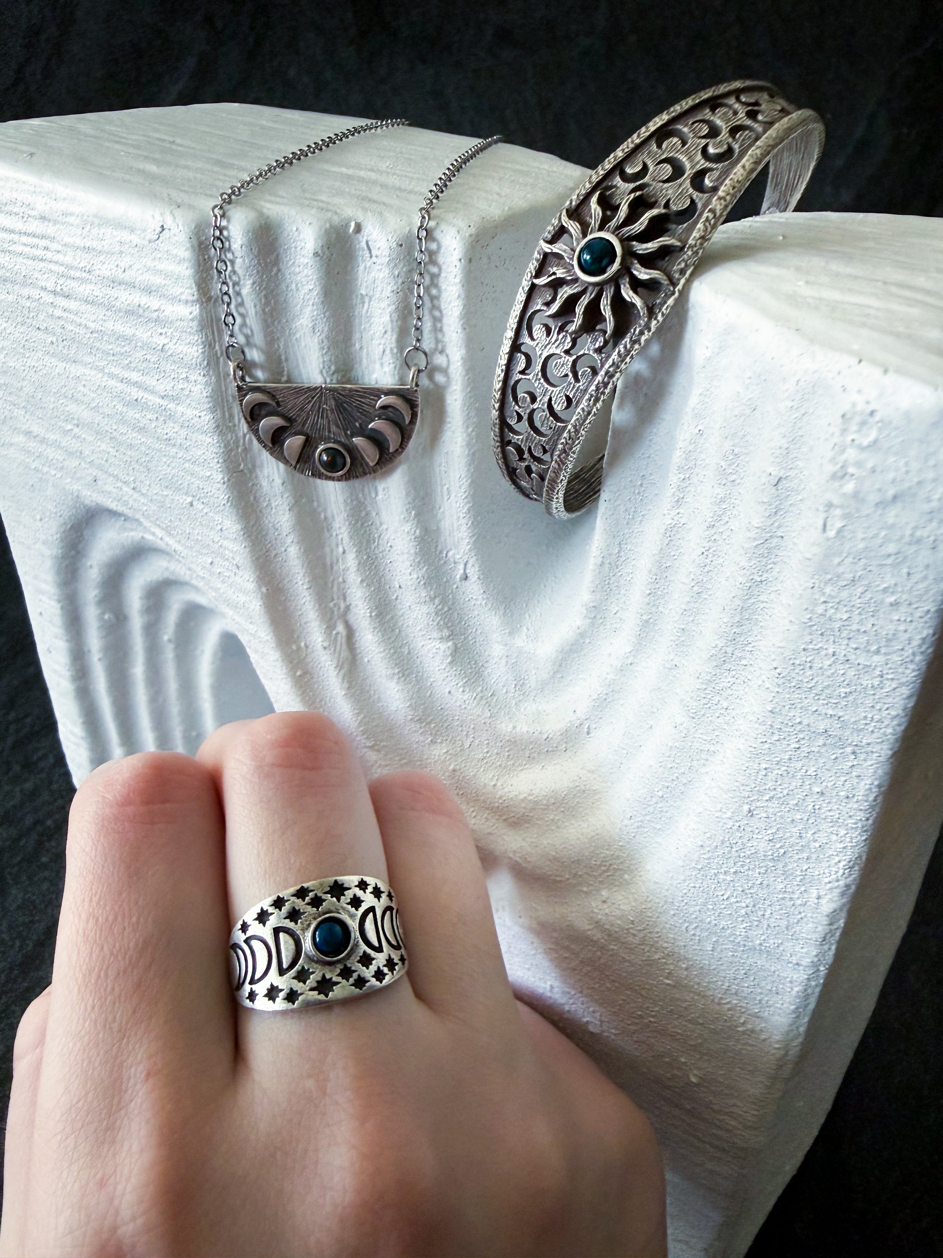 Inspired by eclipses of all kinds, this jewelry set features a lunar eclipse necklace and ring paired with a solar eclipse cuff bracelet that are all set with a colorful, flashy black opal - a dark, mystical and gorgeous stone that's highly underrated!. A beautiful gift for any stargazer!