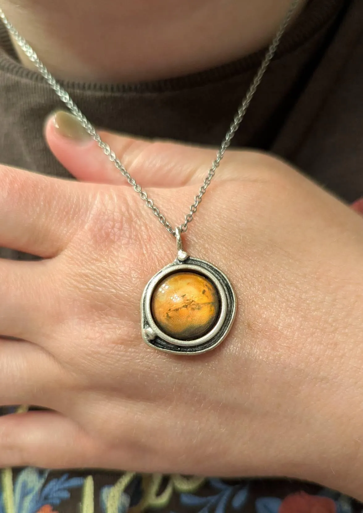 There has been a lot of buzz about the past, current, and future projects surrounding the exploration of our planetary neighbor. We wanted to celebrate! This unique handcrafted silver tone pendant features the beloved red planet in our Solar System: Mars! There are two "orbiting" silver beads around the planet that represent the rocky Martian Moons, Deimos and Phobos. A unique statement for any lover of the cosmos!