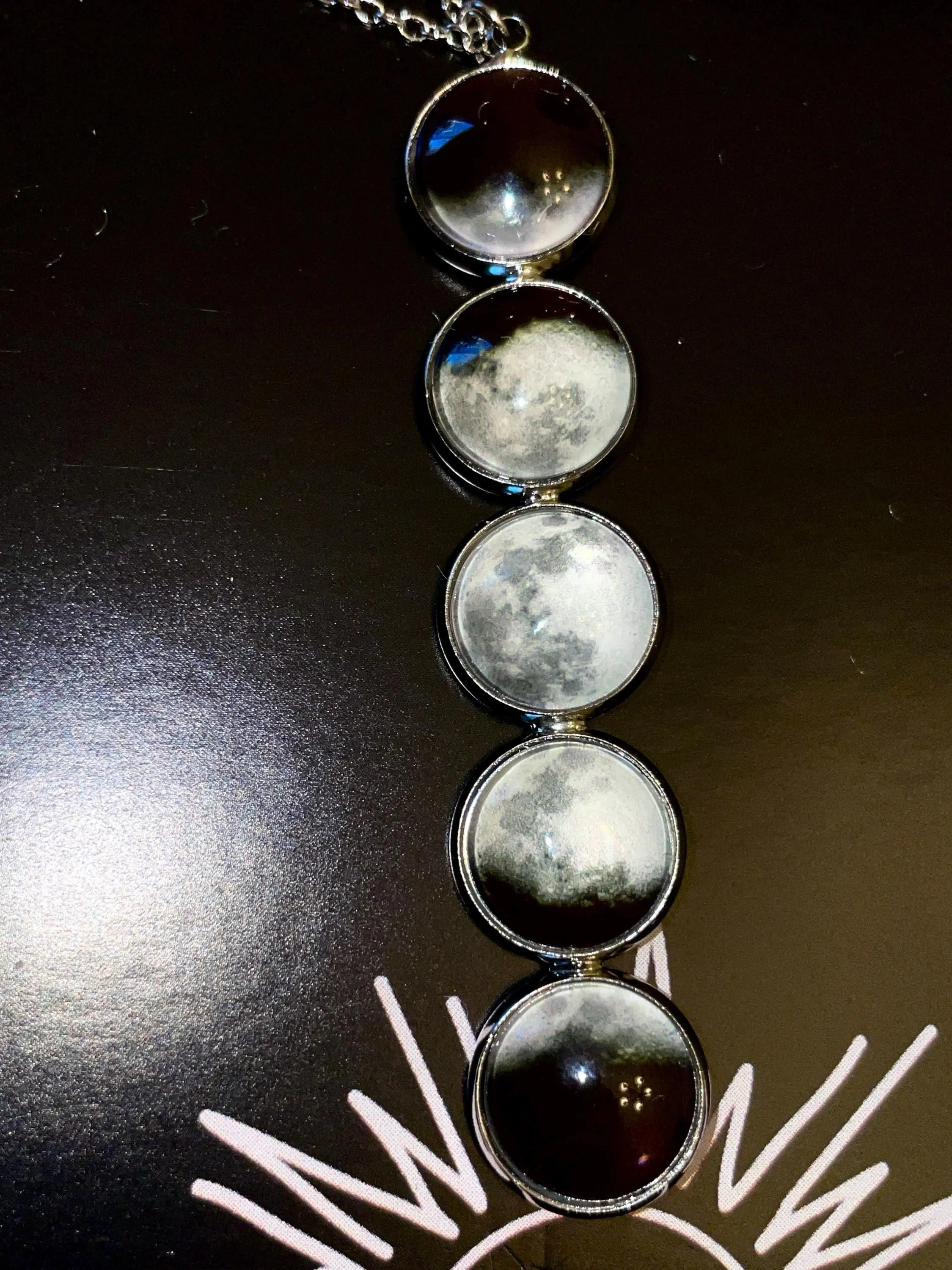 This pendant is exclusively for lovers of the lunar cycle. Simple yet unique, matches any outfit. Beautiful Moon phases nestled into silver tone bezels. Makes a great gift for bridesmaids, Mother's Day, or any random reason to bestow a treasure on your Moon loving fashionista friend. Or yourself! You deserve a treat.